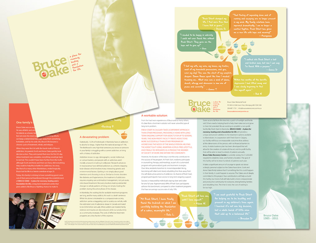 Bruce Oake lost his life battling addiction; his family is worked to fundraise for a facility for other recovering addicts. Materials created needed to be direct, positive and compelling, while honouring Bruce's memory