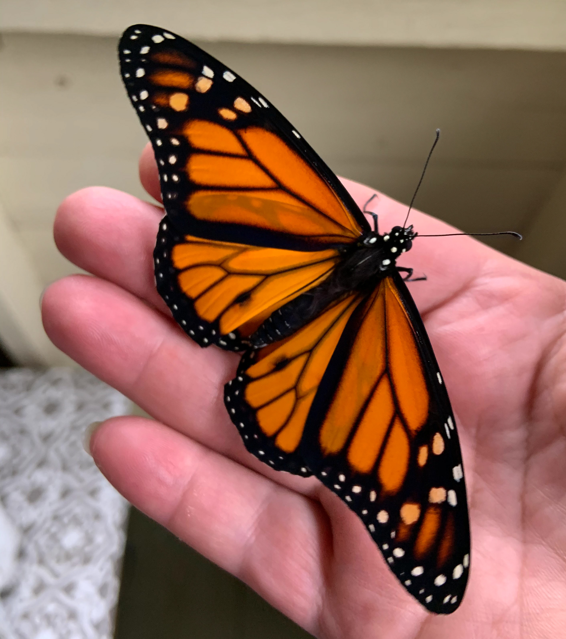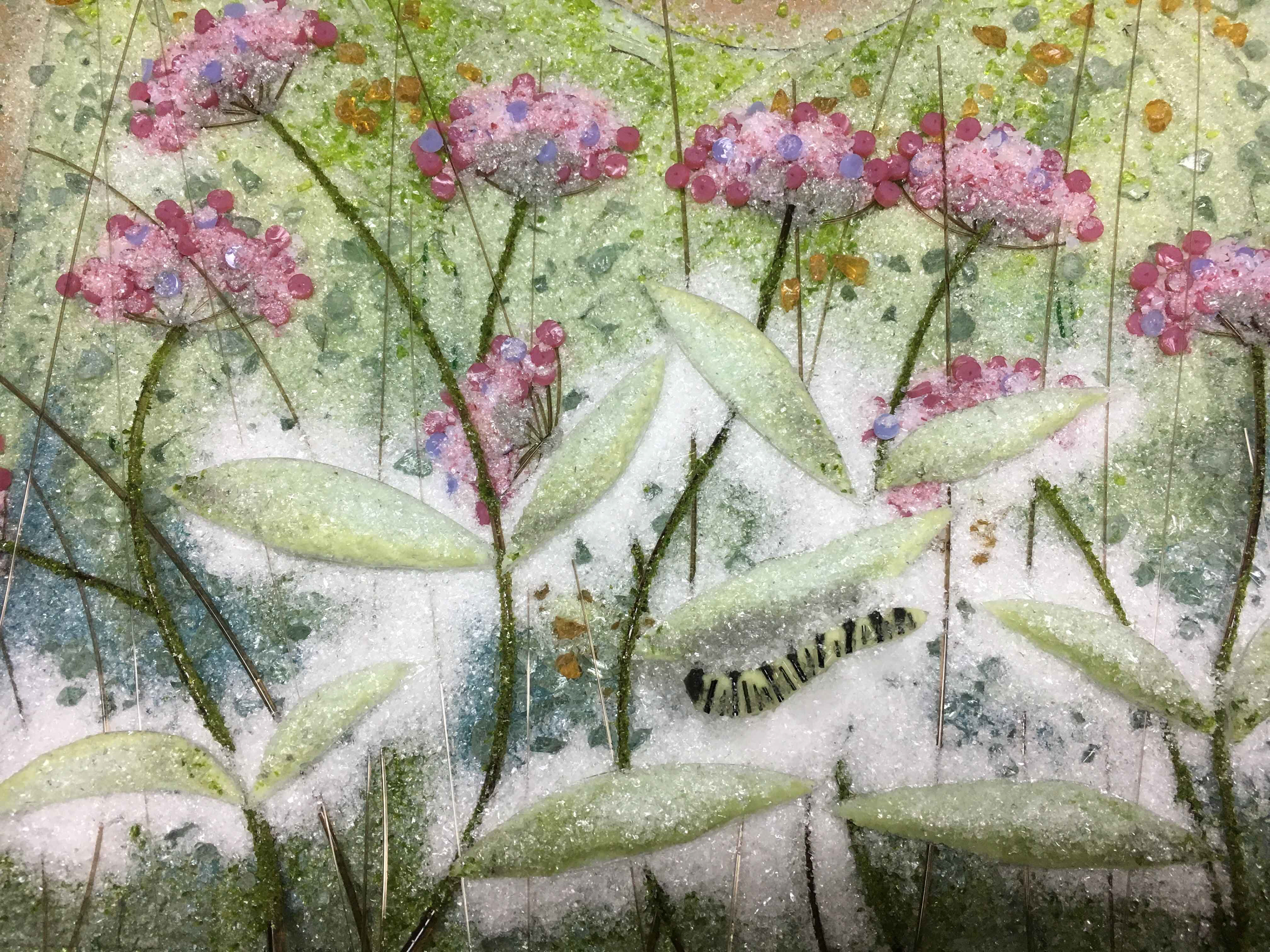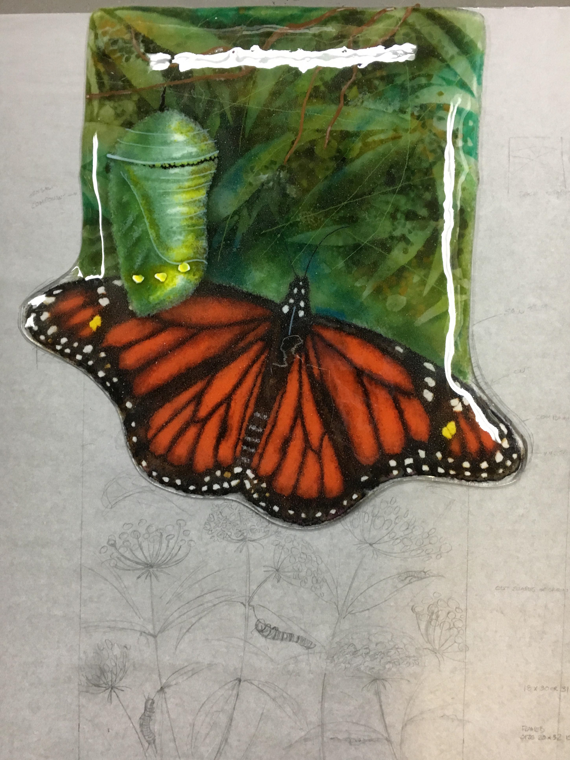 Our passion for raising monarch butterflies was the inspiration behind this fused glass artwork. It is the largest fused glass art I have created so far. Bellow you can see the various stages of assembly. Final fused glass measures 15" wide at the wing tips x 32" in depth. I had to build it in two sections at home, then off site for the final fuse, due to kiln size limitations. The final framed size measures approximately 24" wide x 38" deep. It is available for sale.